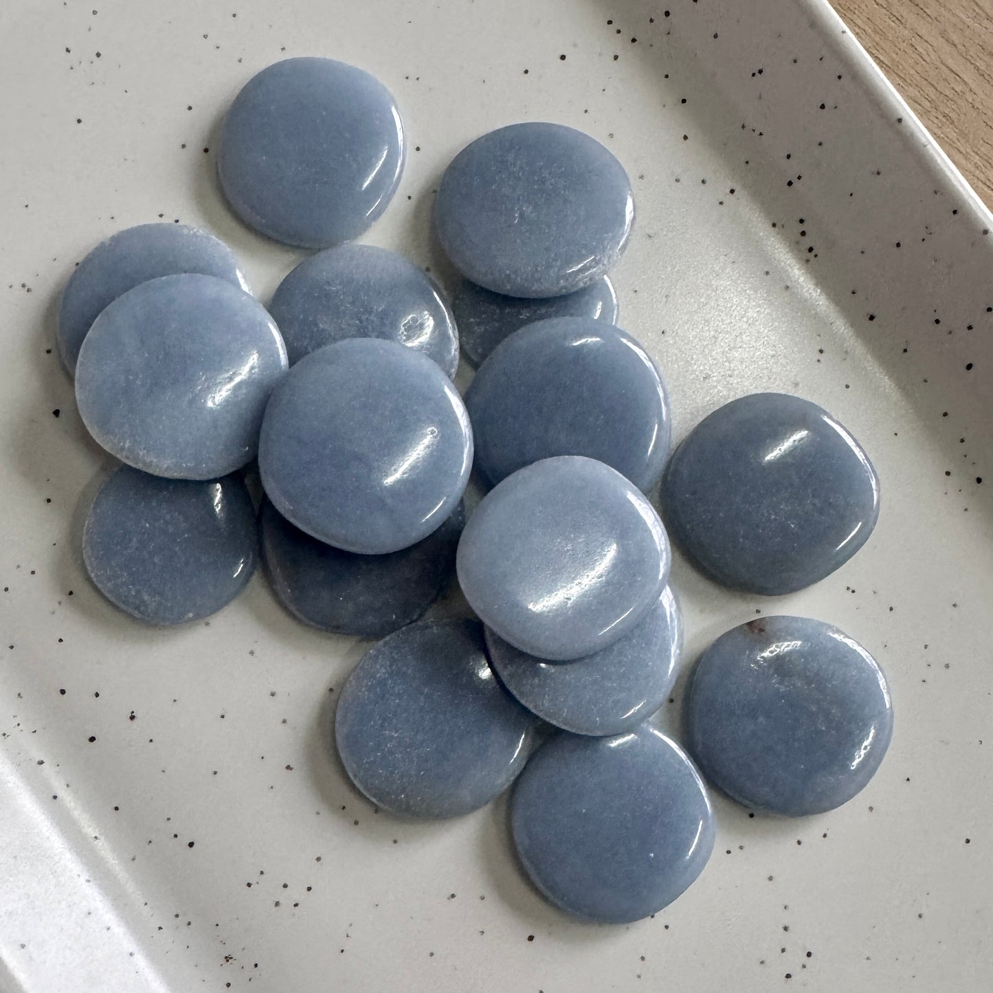 Angelite offers a whisper, not a shout. These thinner, 3cm polished flat stones connect you to subtle realms and support inner peace.
