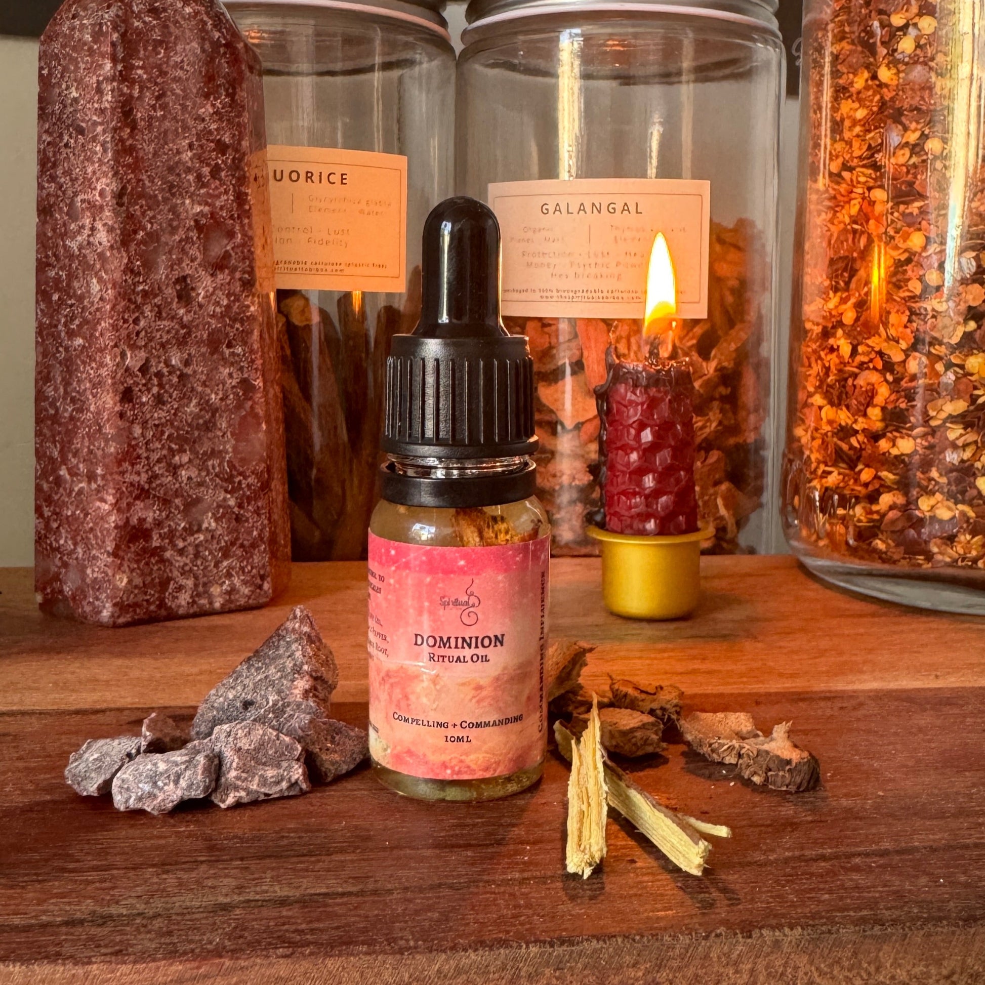 Dominion is a practitioner-crafted, skin safe compelling oil designed to influence, assert, and energetically dominate a situation when the scales of power have been tipped too far for too long.