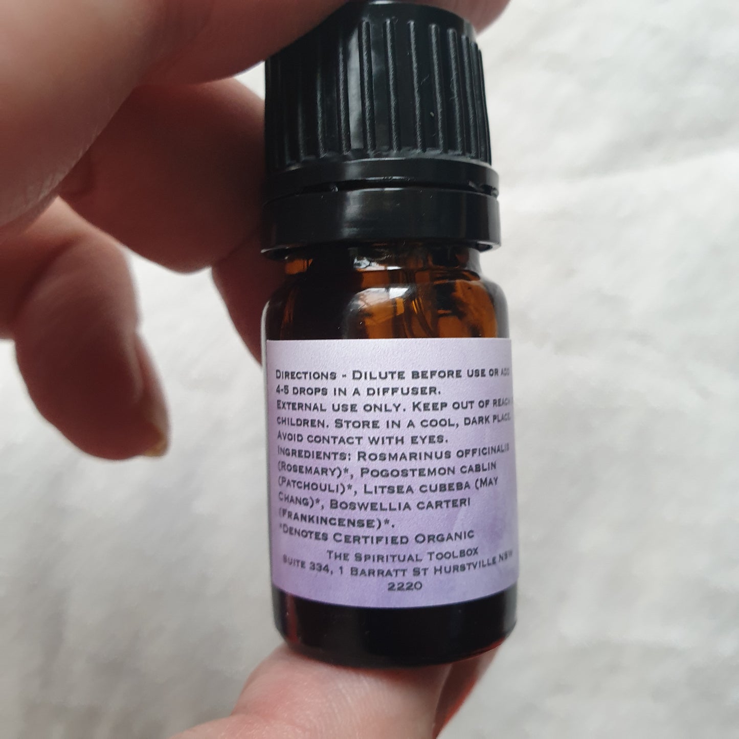 Ingredients: Litsea cubeba (May Chang)*, Rosmarinus officinalis (Rosemary)*, Pogostemon cablin (Patchouli)*, Boswellia carteri (Frankincense)*.