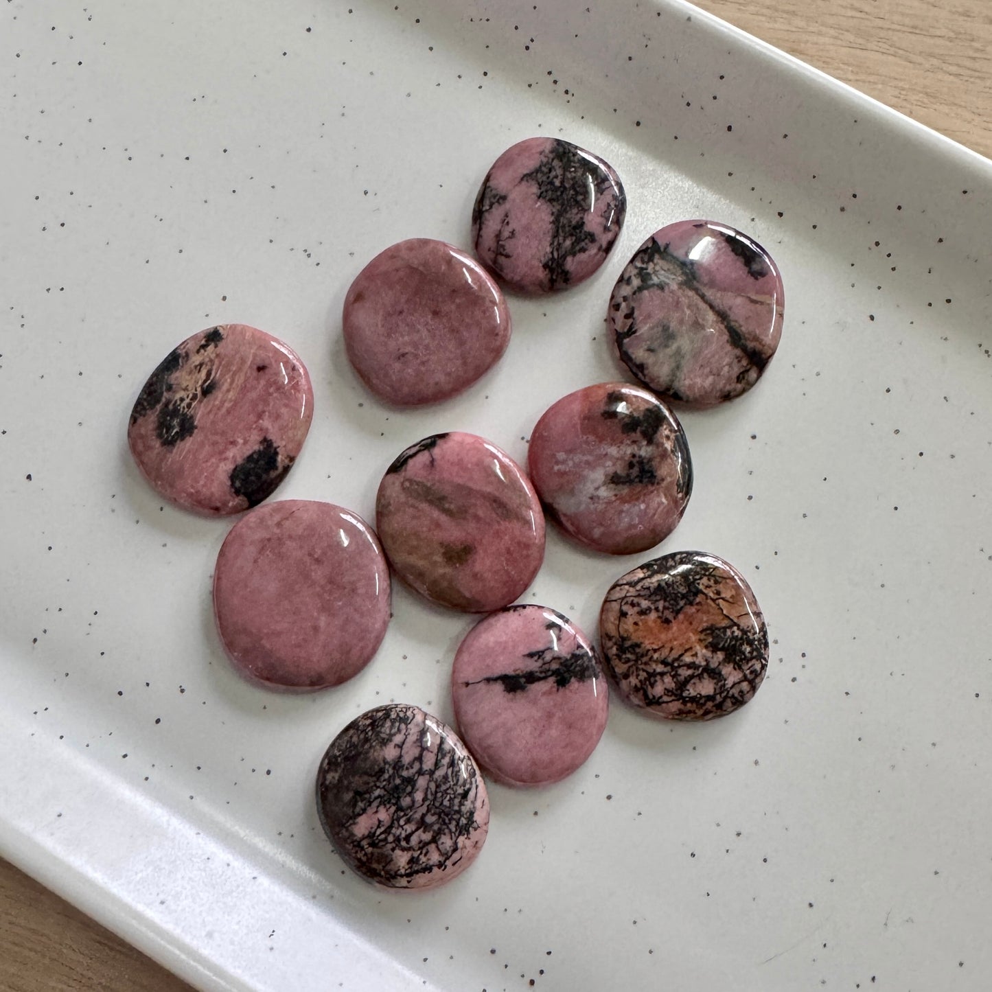 Rhodonite helps you hold the emotional mess, not hide from it. These 3cm polished flat stones are potent heart companions—offering support when processing pain, building compassion, or facing parts of yourself you’d rather not.