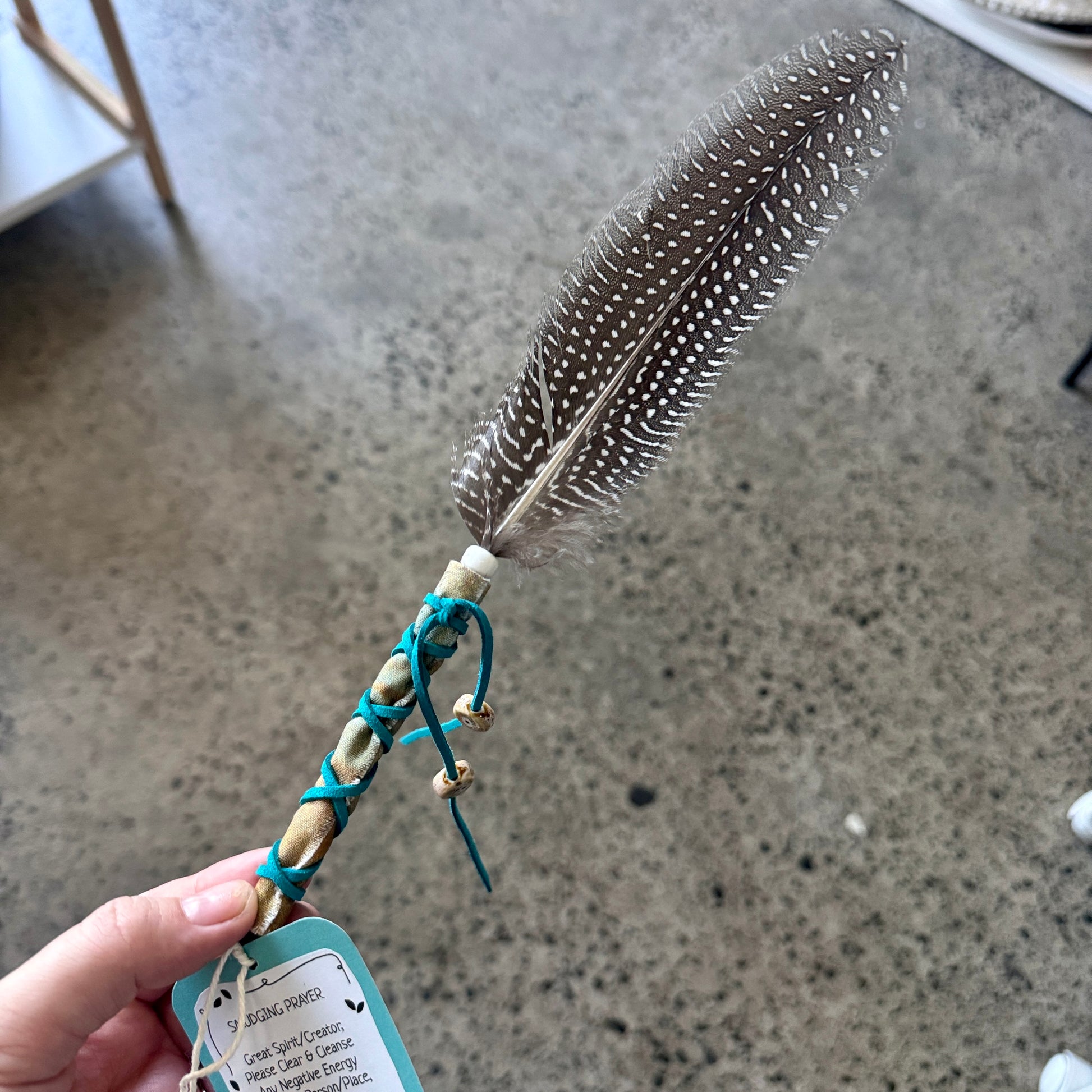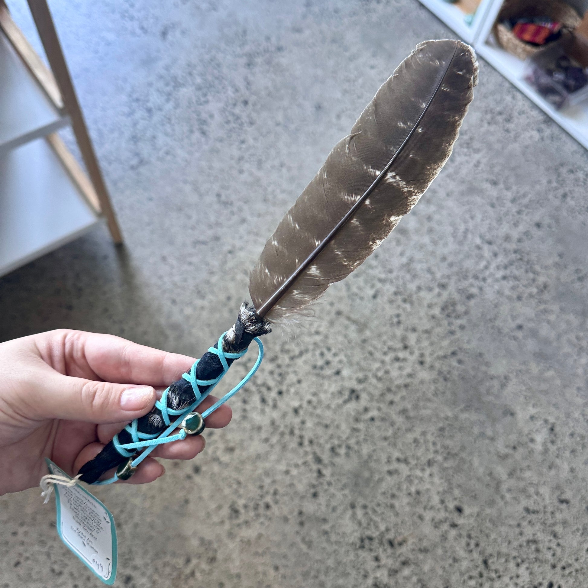 Smudging feathers are used to direct the smoke of sacred herbs such as sage, cedar, or palo santo during cleansing rituals. The feather helps guide the smoke with intention, allowing it to flow where healing or purification is needed, around the body, a space, or an object.